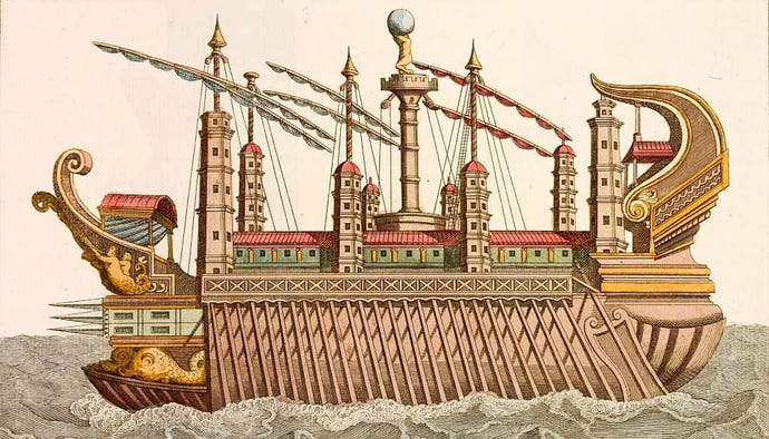 Haha, Caligula, what’s he like? Here he comes, Emperor of Rome, demanding a bridge made of boats across the Bay of Baiae because he wants to ride his horse from one port to another rather than take the ferry. The shootist of TimeSplitters: Roman Through Time is thrust ontothe party pontoon, a bonkers feat of engineering and logistics which will result in several deaths, and not all of them from the player’s shortsword. Caligula is as unsound as a vacuum and makes a grand final baddie, sitting high on his barge throne. That’s a good level.