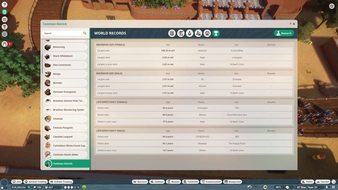 In one of my recent zoos, I decided to make a big multi-species savannah exhibit, which naturally included ostriches. And while managing my flock of rope-necked ruffians into breeding groups, I started looking through their stats in the game’s Zoopedia, in order to see how my ostriches compared with industry standards.