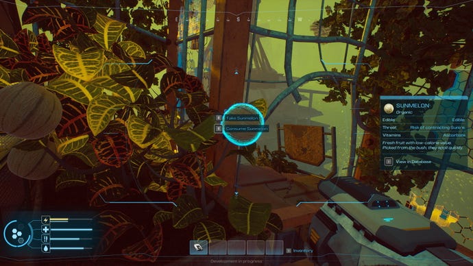I needn’t have been so cautious, really. Despite one landing attempt throwing up all sorts of alarms and warning signals, once you touchdown fully, your ship is anchored in place, leaving you free to roam and scavenge for resources as you please. These might be metallic or synthetic scraps - which you can stick in your fabricator later on to craft more complex bits of equipment for your ship - or you might be lucky enough to find some rogue sun melons growing in a patch of dirt to help you keep your hunger levels topped up.