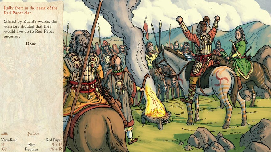 “Zuchi, long known for her lashing tongue, has grown all the more acerbic of late,” says a fresh event in the 18th year of the chief’s rule. The clan have come together to insist that our she be removed. Again, in a typical game I would likely boot her out, or distract everyone with a party. But when I click on Zuchi’s portrait to ask her advice, she tells the entire clan, her own clan, to go to hell.