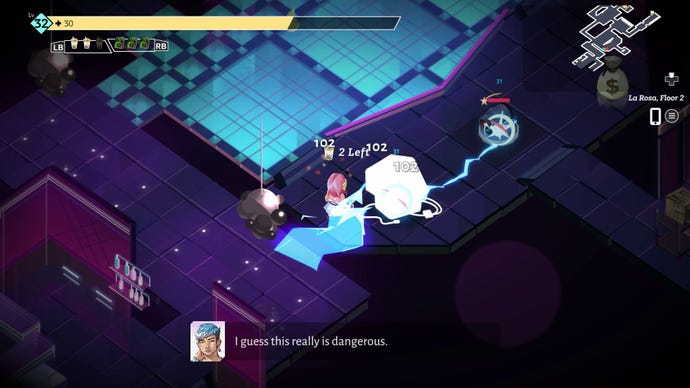 Aiming and dodging can feel a bit loosey-goosey at times, but the levels of the dunj are ultimately easy enough. You’ll hit walls every so often, but you also level up absurdly quickly - this isn’t aimed at hardcore bullet-hell afficionados. And I wouldn’t demand that of it, in fairness. But I did feel let down when it turned out that there were only two dungeons: a mall full of snapping phones and TVs spitting static, and a nightclub basement with aggressive cocktails and speakers shooting explosive notes. I was looking forward to attacking more mal-adjusted representations of my psyche, but alas no.
