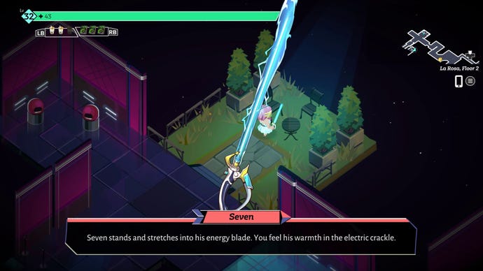 It’s a shame that the dungeons don’t have the same depth. In theory, the combat isn’t treated as an add-on, and it would be nice if it were meatier in practice. I really like how the weapons feel markedly different from each other, feeding in to how you feel about them personally. My favourite, on balance, is Seven, who has a lovely chaining lightning attack and is quick enough that I feel comfortable making jabs in short enemy attack windows. I did also really like Pocket the cat, who turns into bladed knuckledusters (and for the sake of clarity I will state that you are not even presented with the option of necking him), whose heavy attacks can combo into furious leaps and swipes.
