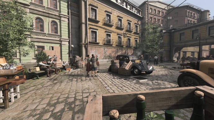 Vanguard’s campaign is at its best when it’s mixing things up with stealth sections and vehicular combat. Moments of quiet also help to humanise characters like Polina, her family, and the ordinary people trapped in the horrors of war. There’s this bit where you share some coffee with her family. One where you scramble across rooftops and bump into friendly neighbours. Another has you stalk a Nazi leader with just a knife in-hand, as you dip between broken book shelves and discarded mannequins.