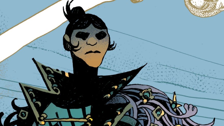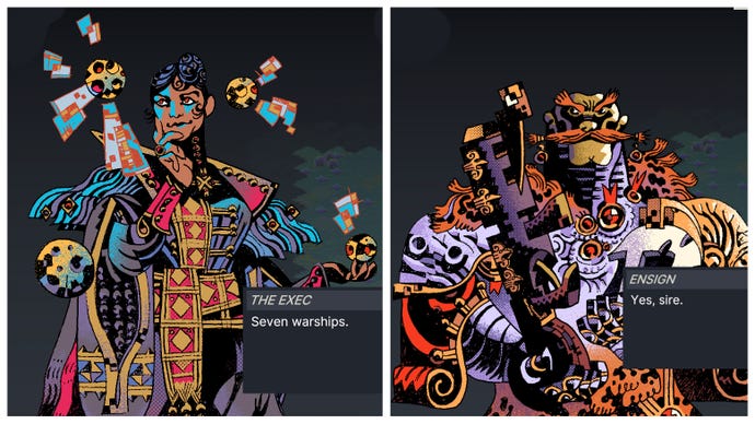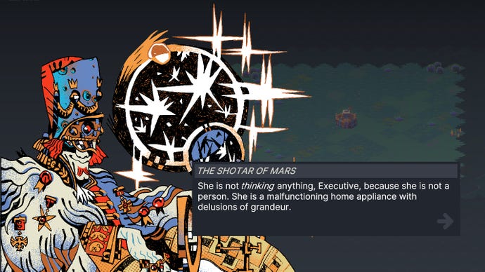 What a fucking art style, no? Gives me a definite sense of reading a giddily weird early 90s French space opera comic, which is never a bad thing. There isn’t too much more character art on show yet, apart from a mustachioed space soldier, who’s even more brilliantly stylised than the Shotar, and a character called the Exec, who I suspect will be a big deal in the full game.