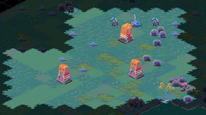 The very first unit you deploy is a mightily odd contraption like a medieval siege tower with tank tracks, which drops from orbit with a belly full of miserable conscripts. It begins to trundle across the teal-and-peach landscape with tiny pixellated pennants fluttering in the breeze, and is utterly wonderful. This sort of stuff, if you don’t already know, is my idea of a damned good time, and it immediately made me feel a fierce sense of loyalty to Cantata. That’s a good thing, mind, because it’s not the easiest game to love.