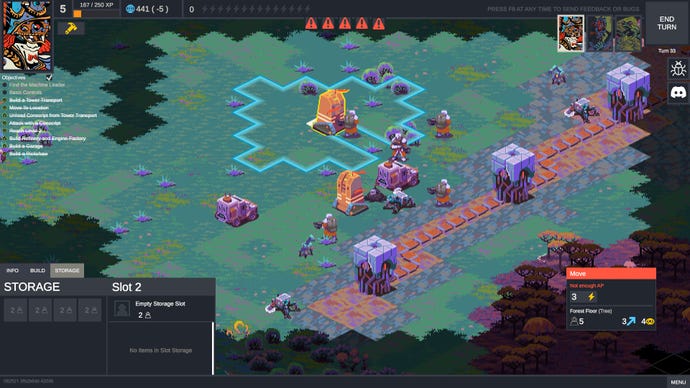 The actual tactical model is sound and time-tested: you have a pool of action points, which any of your units can draw from in any order, to move and fight. You also need to draw on this pool yourself, to build production structures and more units. The AP pool doesn’t stretch very far at first, but as your units fight on, they accumulate XP for you as their commanding officer. This allows you to level up, increasing both your AP pool, and the variety of structures you can build.