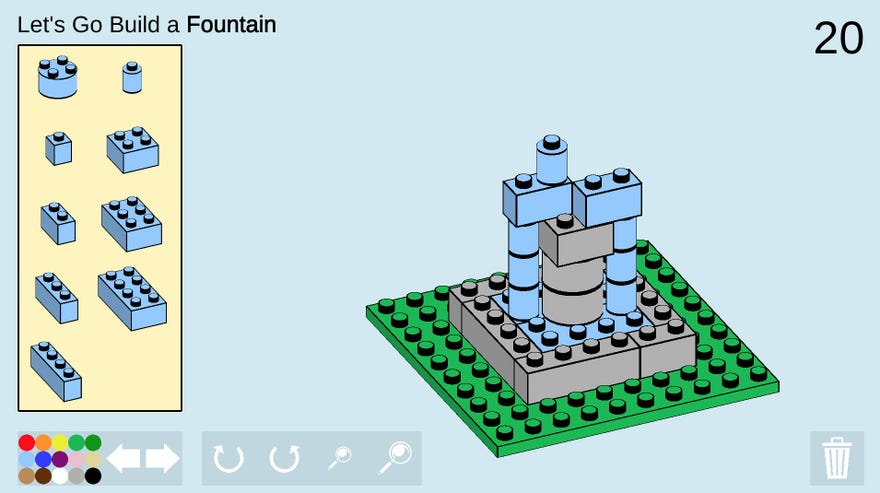 Remember threeyearsmonths ago when we were all really into building tiny houses inThe Sims 4? This is like that but withLegoslittle colorful brick toys. A new browser game challenges you to build a thing every day with just 20 bricks, which sounds like a challenge and is even more so when you actually attempt it. Look at my little fountain. I’d have liked it to be symmetrical and all but this is as good as I could do in 20 bricks so here you have it.