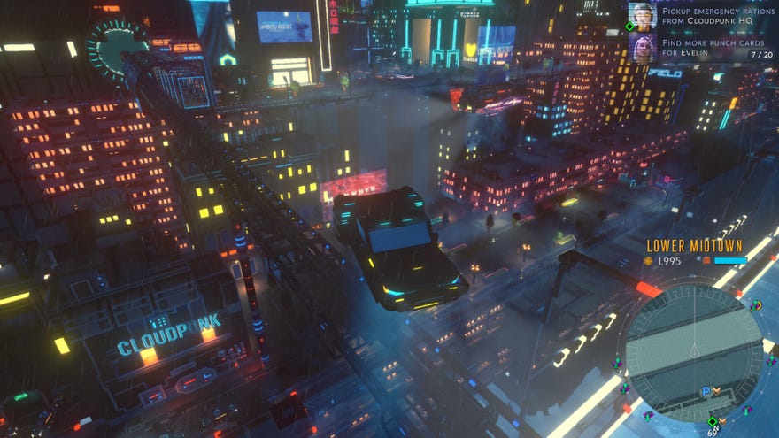 A photo tour would be wonderful, although slightly tricky as the free camera mode only works when you’re stationary. But I’ve not even explored much, which now that I think of it is surprising. I invariably run off into the hills in most games, but in Cloudpunk I’ve gone straight after the next delivery, after the next conversation with the next person. The story has got me curious, which is impressive given that the city is such a draw.