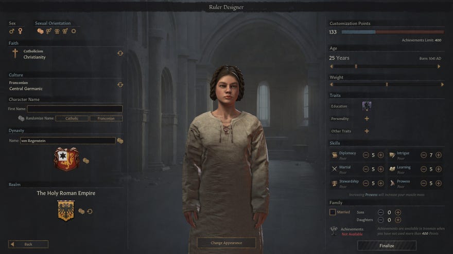 So! You still pick your starting position, same as ever, but then have the option to create your own starting ruler. You can design the look, for starters, with loads of sliders and styles to create a pretty wide range of folks. And yes, you can make frightful folks if you want - I’d say it falls somewhere betweenSkyrimandDark Soulson the Potential Hideousness Scale? Then you can customise aspects of their life and personality from sexuality and age to skills and traits, as well as giving them a family.