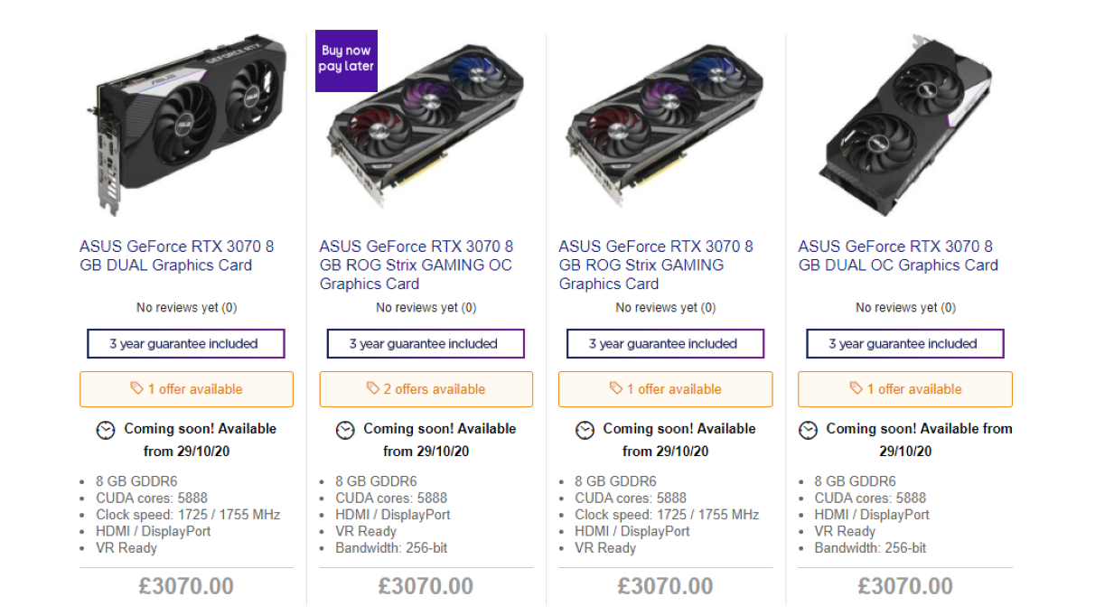 Thankfully, none of the Currys PC World RTX 3070 cards are actually available to buy just yet, and their respective prices of £3070 are clearly an error (what with it being the same number as its own model name and all that). Besides, this is a card that’s only meant to cost £469 / $499 according to Nvidia’s official pricing - although given how muchRTX 3080 cards suddenly appeared on Ebay forafter it sold out in minutes on September 17th, I wouldn’t be surprised if some ruthless scalpers tried to get some poor saps to stump up £3070 for it anyway.