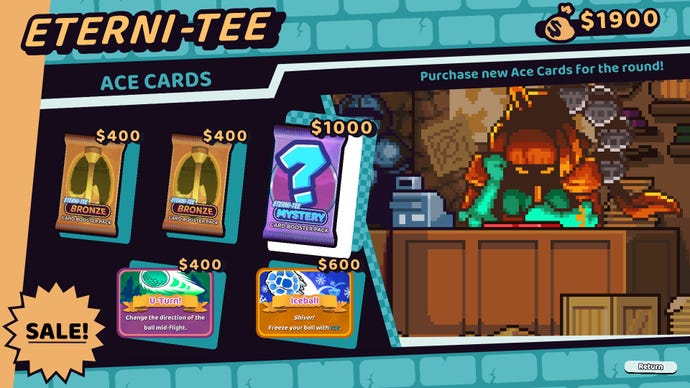 I’ve played difficult roguelikes where runs take hours and I’ve failed time and time again, but it feels more frustrating here. I think my main quarrel is that Cursed To Golf just doesn’t make failure fun or rewarding. When you’re sent back to the start, nothing changes, and courses aren’t interesting enough to get me excited to retry them. Dungeons switch up their layouts but lackluster course variety and a hesitancy to experiment make golfing through them agrind. There are different pathways to choose from, including deadly maze-like challenges to try for rewards, but the game practically throws ace cards and money at you, so I didn’t want to risk failure on a more difficult course that I could easily avoid.