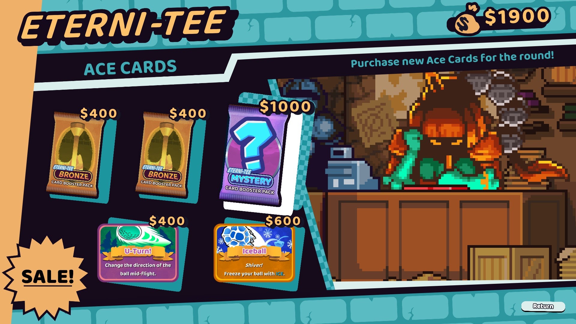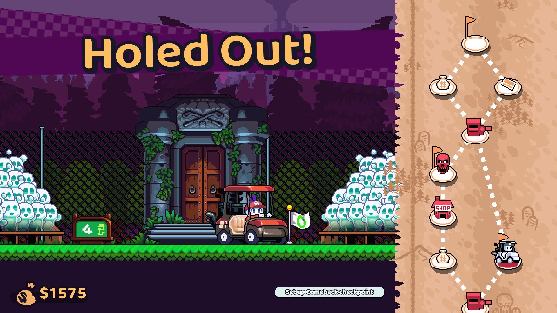 I’ve played difficult roguelikes where runs take hours and I’ve failed time and time again, but it feels more frustrating here. I think my main quarrel is that Cursed To Golf just doesn’t make failure fun or rewarding. When you’re sent back to the start, nothing changes, and courses aren’t interesting enough to get me excited to retry them. Dungeons switch up their layouts but lackluster course variety and a hesitancy to experiment make golfing through them agrind. There are different pathways to choose from, including deadly maze-like challenges to try for rewards, but the game practically throws ace cards and money at you, so I didn’t want to risk failure on a more difficult course that I could easily avoid.