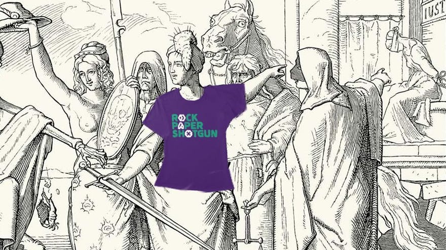 You may remember a while back that we dipped our toe into the sea of merchandising, and we have now decided to roll our trousers up and wade a bit deeper in. To this end, we now have a brand spanking newTeespring store! Check out the wares we have currently on display.Come for the high quality wearables, stay for the item descriptions. My favourite (on both counts) is probably the classic logo tee, modelled in the header image (actual fit may vary). It is a very lovely shade of amethyst, and is described thusly: “What’s green and purple and proclaims your interest in reading about PC games? Not an aubergine with “I like reading about PC games” scrawled on it, as you might imagine, but this fetching classic T-shirt”.We also have a hoody and a white tee with the fearsome PC Goliath, fighting the triplet gladiators of Rock, Paper and Shotgun - representing the staff’s daily struggle to best the beast of PC games.The Goliath appears on the back, which means if you walk backwards at someone they’ll think you’re really tough, but anyone approaching from the front will be fooled into thinking you’re normal.All the items can be used as a makeshift sling for hurling rocks, or to staunch blood from flesh wounds, for when you inevitably get into brawls with people who like other, inferior websites.We’ll be periodically adding new stuff to the store from now on (possibly even seasonally themed things!), and not just bits of cloth to wrap around your torso. What is a PC site without a range of mousemats, for example? And Alice Bee has been hammering daily on Graham’s virtual desk for an extensive line of “You Don’t Have To Be Alice To Work Here… But It Helps!!!!!” goods. There’s no telling what we might be able to get past him.