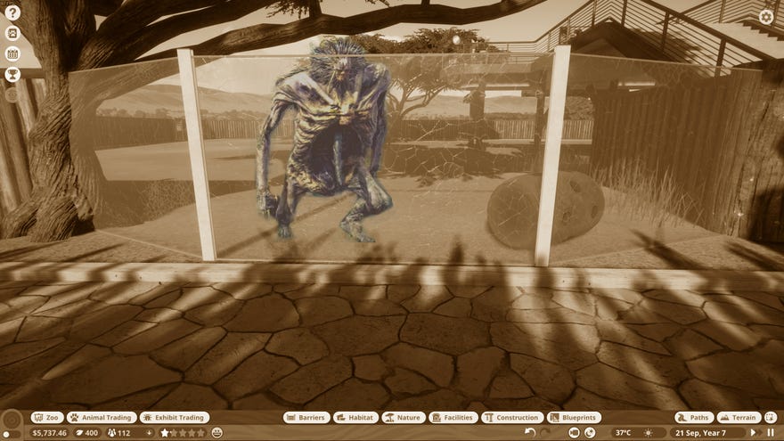 Just imagine a serene, buttoned-down game likePlanet Zoo, only the sky is the colour of a dying man’s piss, and you’re trying to work out what to feed that fucking awful spider boss off ofBloodborne. Or building a ruined castle big enough to keep some ghastly, manky dragon contained. Or putting a fake carriage into an enclosure as an enrichment activity, to keep those two big-chested lads off of the Elden Ring trailer occupied.