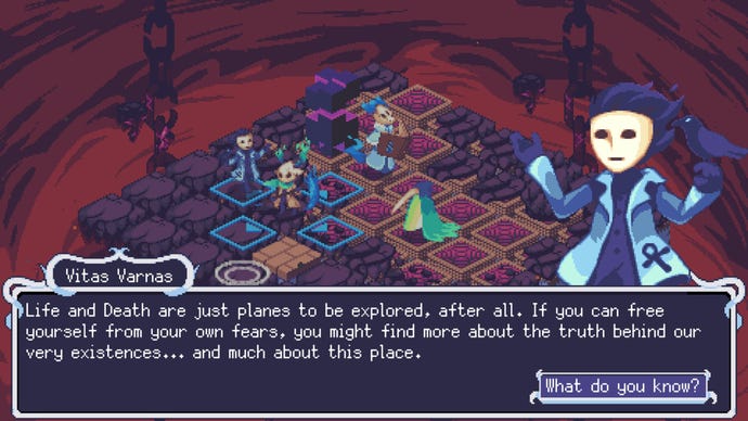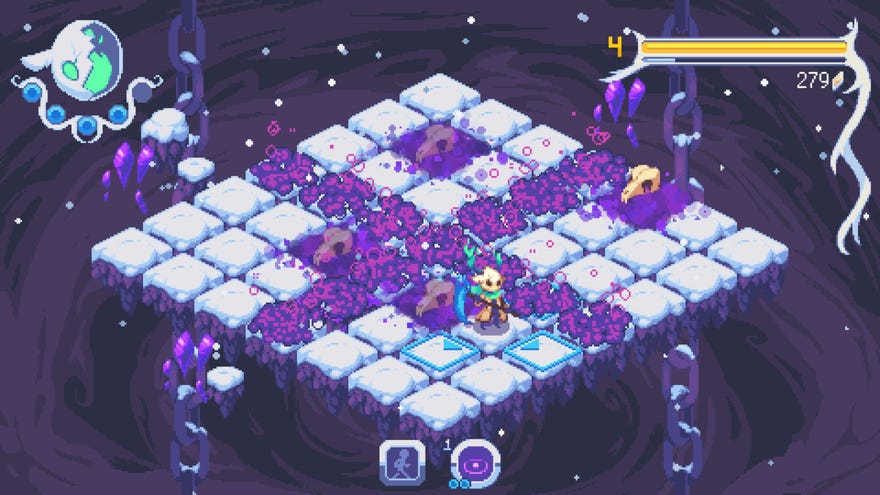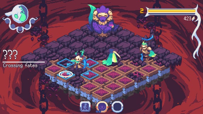 I don’t want to rag on it too much. It’s clear a lot of work went into this. There is vivid pixel art, with lots of melty transitions, heavy on the necromancer purple and done with a lot of love. There are glistening scythes and mysterious characters and everyone wears bone masks reminiscent ofHollow Knight. The chirping music evokes SNES-era bangers, even if it never truly finds a groove of its own. And there remains a compelling spirit to its rhythmic obstacle course of hops, skips and jumps. It is also difficult in a way that many will find inviting, with 99 floors to overcome, interspersed with bosses that demand even more spatial awareness and careful skittering across the tiles.