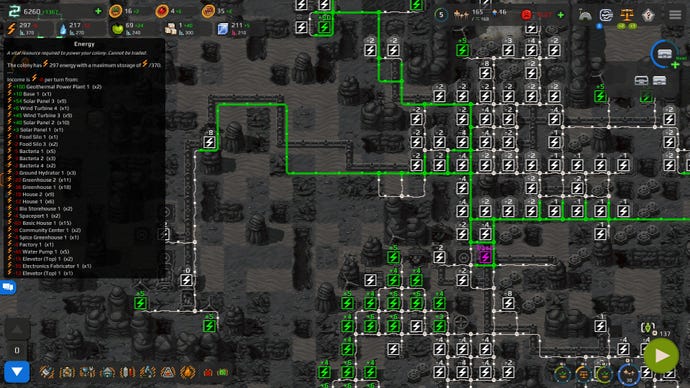 We’re on Mars here though, remember? Much of the terrain isn’t suitable for building on, and this proved to be one of the fundamental causes of my occasional primal screams of anguish. The good news is, tools are available to change the status of terrain. Dig up the ground to make it usable, say; blow up a mountain, fill in a canyon, or create a lake. The bad news is, the tools you’re given are pretty sporadic and many require specific types of terrain combinations to be used. And, especially early in a colony’s development, you are entirely at the RNG’s mercy when it comes to which tools you get. Oh - and it’s not guaranteed that you’re given a new one on every turn, either. The food, water, electricity, and cash cheerily marching out of your reserves won’t wait for the turn where the right tool finally arrives. There’s a time limit on the standard campaign difficulty, too.
