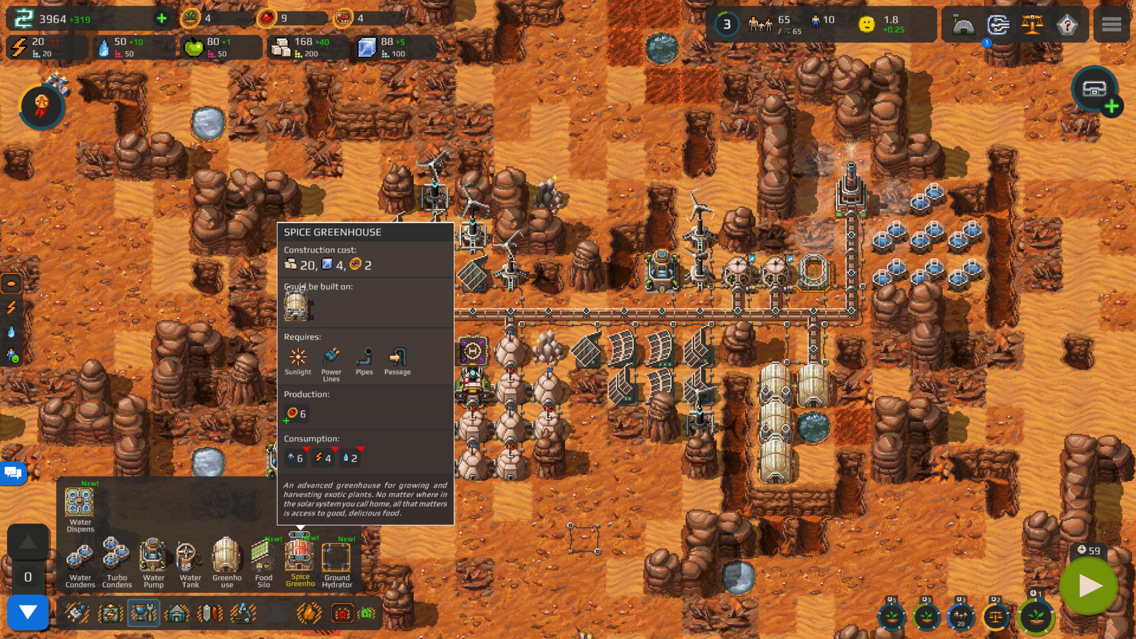 The more your colony expands and the greater the demand on your resources, the trickier it becomes to balance what you should build and where. Should I surround a water source with greenhouses for food, or stick a water pump on top for water? Or maybe I should build a swimming pool (yes, a swimming pool on Mars) to increase happiness? Again, pretty standard city-building stuff. Some of the internal logic is bizarre, though. Build a park, and it closes every time you run out of spices. Erm, why?