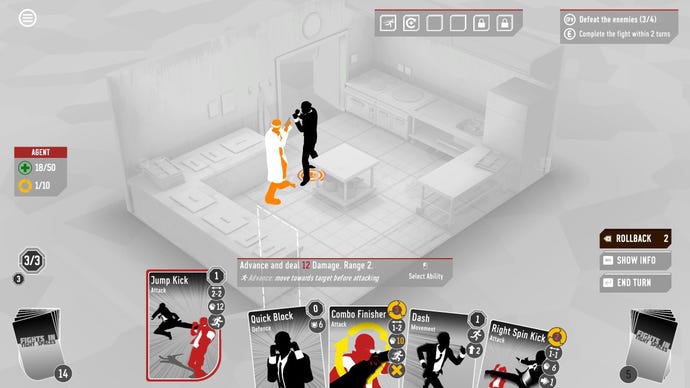 But Fights In Tight Spaces trades in the magic and swordplay for just, straight up, punching a dude in the face. It’s not entirely dissimilar toJohn Wick Hex, but all of your attacks come in the form of cards. As juvenile as it sounds, every attack you would ever want in a game like this is here. And they’ve all been realised fantastically through some cartoon-y yet visceral animation work. You can headbutt enemies, throw them into walls, and even counter attacks as they come in towards you. Even Guile from Street Fighter’s Flash Kick is in here. Plus, for the deadlier blows you land, the game will cut to a close-up angle to give you a front row seat to your own handiwork. It’s so much fun kicking enemies across a room, then watching their bodies ragdoll and crumple up on the floor.