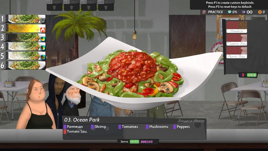 I played the first CSD on my iPhone using touchscreen controls, so the keyboard control scheme for CSD2 came as something as a shock to me. Every day you prepare a menu for your restaurant, choosing some recipes that you can keep in a holding station like soup or chilli, and others that you have to prepare to order, like fried foods and pasta. Each ingredient is associated with a letter, so to prep things you need to hammer keys in the right order.