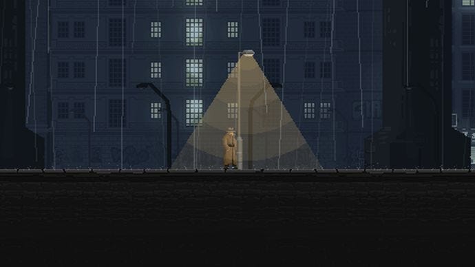 Gunpoint is a game about being a private detective with really bouncy trousers. That’s literally true. Right at the start of the game you - Richard Conway - become the proud owner of some “Bullfrog hypertrousers”, which allow you to sproing inconceivably high into the air, and fall enormous distances. Blessed with these springy garments, you’re ready to infiltrate the buildings of various corporations, as you become embroiled in a tale of corporate espionage, secret weapons, and moiiirrrder.