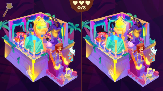 The game is peppered with other mini-games (spot the different, or some sokoban-adjacent puzzles), but the diorama puzzles are your principle challenge. They grow larger and more complex as levels progress, usually starting with a four or six piece segment - a penguin at a luggage check-in, for example - before zooming further out. You’ll get the security area next to the carousel, then the departures lounge, then the parking spaces outside. But the luggage check-in is still there, it just takes up a couple of squares on a much large puzzle now.