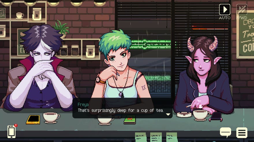 It’s very relaxing, and the conversations you have with regulars and newcomers alike feel very cosy and amiable against the low-fi beats of its exquisite soundtrack (which you can also pick yourself using the in-game music player). You don’t have much control over the story, mind. You’re a largely silent onlooker to the ensuing drama of these characters' lives, and while your character occasionally interjects, your words don’t have any bearing on the outcome of the story.