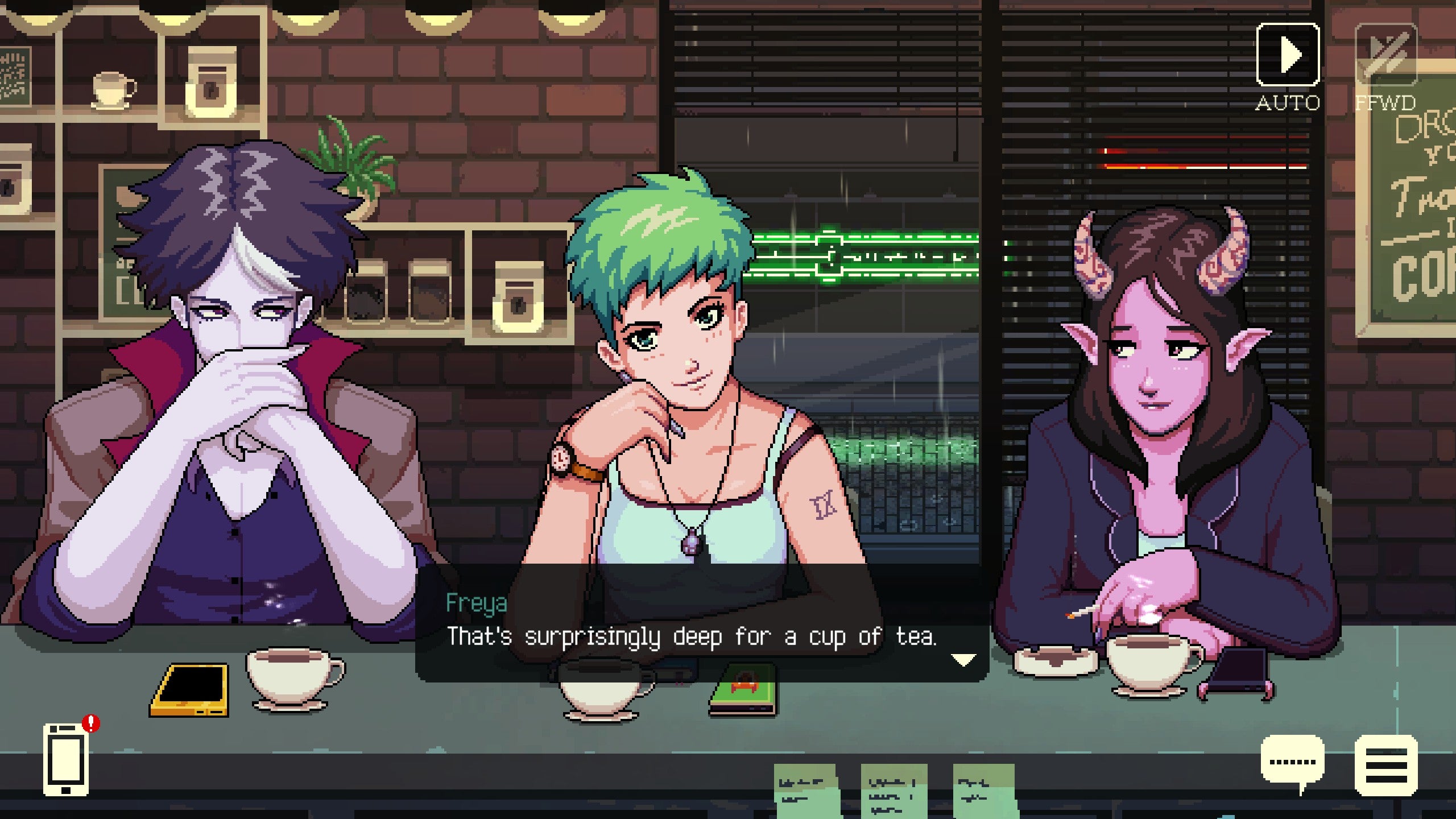 It’s very relaxing, and the conversations you have with regulars and newcomers alike feel very cosy and amiable against the low-fi beats of its exquisite soundtrack (which you can also pick yourself using the in-game music player). You don’t have much control over the story, mind. You’re a largely silent onlooker to the ensuing drama of these characters' lives, and while your character occasionally interjects, your words don’t have any bearing on the outcome of the story.