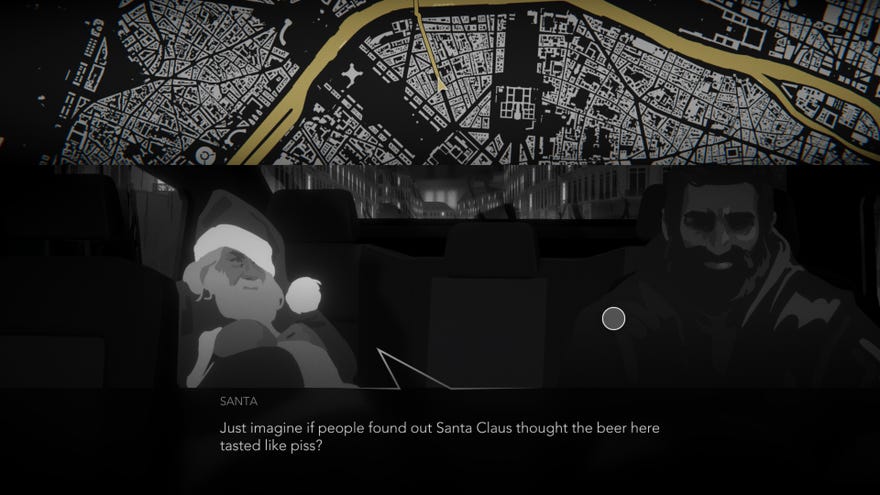 At first I thought he was just some drunk who’d put on a Santa outfit for a laugh. He certainly didn’t act like Santa, and goodness the language! Ranting about “this manure-pile of a new generation” and how “Parents are losers, idiots” and “the real problem” of the world. What would Mrs Claus think? But then he started talking about how he remembers everyone he meets and how, as a child, my driver had such god-awful handwriting that his letters to the North Pole were practically impossible to decipher. My driver reacted like he’d been punched in the stomach. Just whowasthis guy?