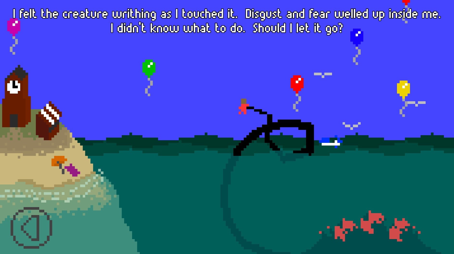 It has multiple endings, depending on your choices (and some reflexes, although it’s not very demanding). I was always fond of picking up all the humans, pulling them around a bit, then plopping them safely back down again. If you go swimming here the beast might wave you around a bit. It’s just a thing that happens, don’t worry about it.