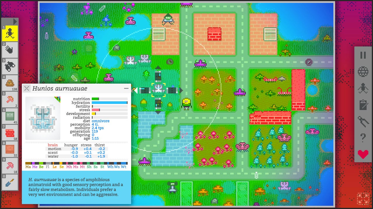 Have You Played?is an endless stream of game retrospectives. One a day, every day, perhaps for all time.I have tried and failed to playVilmonic. It’s an artificial life sim where you’re in charge of your own organisms, cultivating the ideal conditions for them to prosper and grow. ThinkCreatures, but with optional genome editing.It’s too much for me, but it is fascinating.You start off with dreams and a spade. If you want prosperity, you’ll need to muck in directly to make it happen. There’s a crafting ladder to climb, where tools and buildings let you shape the future of your own pet species. You can wall in animals for controlled breeding programs, carefully pairing off those with desired traits. Maybe you’re after a better sense of smell, or superior water retention. Maybe you want to turn your creatures into carnivores.It’s a chance to play God, albeit a God that struggles to wrap their mind around metabolic cycles. Some people play Vilmonicand become scientists, and their accomplishments are magnificent. They do actual research, and build on each other’s discoveries.They’re the real gods. I’m content to watch them.
