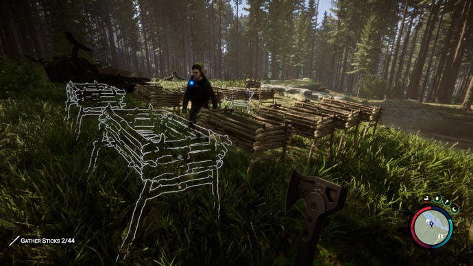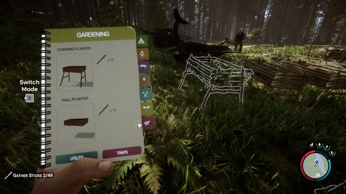 It all started when I learned that Sons OfThe Foresthas a peaceful mode, which completely removes all the gross, yucky cannibals, leaving you to grapple with survival in relative peace and quiet. The first time I met up with Kelvin and we got to work, casually making our shitty shelter and stick storage, I perused the guidebook to see what’s next, and I spotted a planter. A planter? Okay, so I assume you can plant seeds and grow food, then? That’s really co-WAIT, wait, wait. You’re telling me this is basically a farming sim?