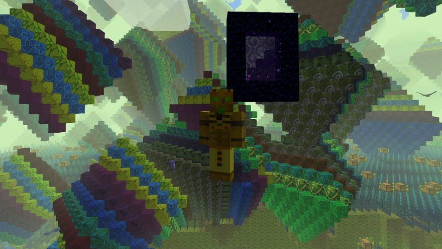 Then, get yourself dimension-hopping! All you need to do is write something in one of the books and chuck it into the portal, which should turn a weird colour to let you know it has worked. The thing you write in the book serves as a seed to generate a dimension with an impressive list of randomisable factors (it’s explained, along with a list of pre-set Easter Egg worlds you can visit, onthis here wiki). You’re highly unlikely to get the same one twice, as there are more than two billion dimensions possible for any givenworld seed, and therefore around 40 octillion in total. Which is a bit Yikelangelo’s David, isn’t it?