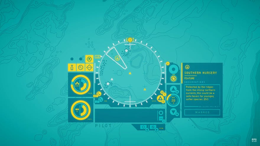 It’s an infinite universe, you know. And if there’s life out there, there’ll be absolutely tons of it. Loads and loads and loads of planets, with unfathomable numbers of worms and that to categorise. But the human imagination is, alas, less infinite. And so, even though there could be as many games about exploring alien oceans as there are (potentially) alien oceans to explore, any such game will instantly be compared with the mightySubnautica, and will have to work hard to prove its originality, if it wants to make a name for itself.Enter, then,In Other Waters. It’s one of the gamesthe RPS VidBudshave been playing this week as part ofRezzed Digital, and indeed, its premise is near identical toSubnautica’s: someone is stuck on a watery alien world, and explores the local ecosystem while working away at some larger mysteries. But beyond that premise, it takes a wildly different approach to almost every element of its design, to the point where comparison is near-meaningless. And you know what? It’s bloody brilliant.In this game, you play as a computer. Or at least, something installed in a computer - I’m not certain exactly what. And neither is Ellery Vas, the scientist whose dive suit you’re embedded in, and in control of. Awkward. After a fantastic little start sequence, which you shouldwatch Astrid’s videoto see for yourself, you work out what you’re doing, and begin to assist Ellery in navigating and moving around.But there’s no first person perspective here, nor any spectacular 3D seascapes - you experience the whole world via a gorgeously understated UI, painted in the most relaxing colours known to humankind, and pootle your human companion around the world as a dot on a contour map. Strangely enough, the whole interface reminds me very much ofNauticrawl, a splendid, odd little game about stealing an inscrutable mech, whichmy mate Ghoastus played last year. Only while Nauticrawl was a brutal exercise in learning through failure, this is a gentle, relaxing and - as far as I can tell - entirely non-violent experience.Now, if you’re anything like me, you’re probably feeling an initial slump of disappointment that you won’t actually get to see this incredible alien environment that Ellery is stuck in. If I’m honest, when I first twigged what the shape of the game was, I was actually quite cross, as the UI felt almost cruelly designed to omit all the things I had been most excited to see. But that disappointment only lasts until you get a feel for how utterly stellar IOW’s writing is.In this case, words paint a thousand pictures. Ellery’s dialogue, and the reams of text that describe all the things she’s seeing, is near-flawlessly engaging, and I was amazed at how quickly I built up a solid mental image of the geography and ecology of the game world. And indeed, For all that you can’t swim around with it, IOW’s xenofauna is - I think, at least - more nuanced and plausible than Subnautica’s.I’m not knocking the Subnautica menagerie, because the creature design was superb, of course. But at the end of the day, most of the game’s animals existed either to look cool or to scare the honks out of you. Here though, is something completely different. And, if the rest of the game is anything like the bits I’ve seen so far, it’s something extremely special. When it’s available onSteamnext week, I’m going to be diving right in, and I strongly recommend you do as well.