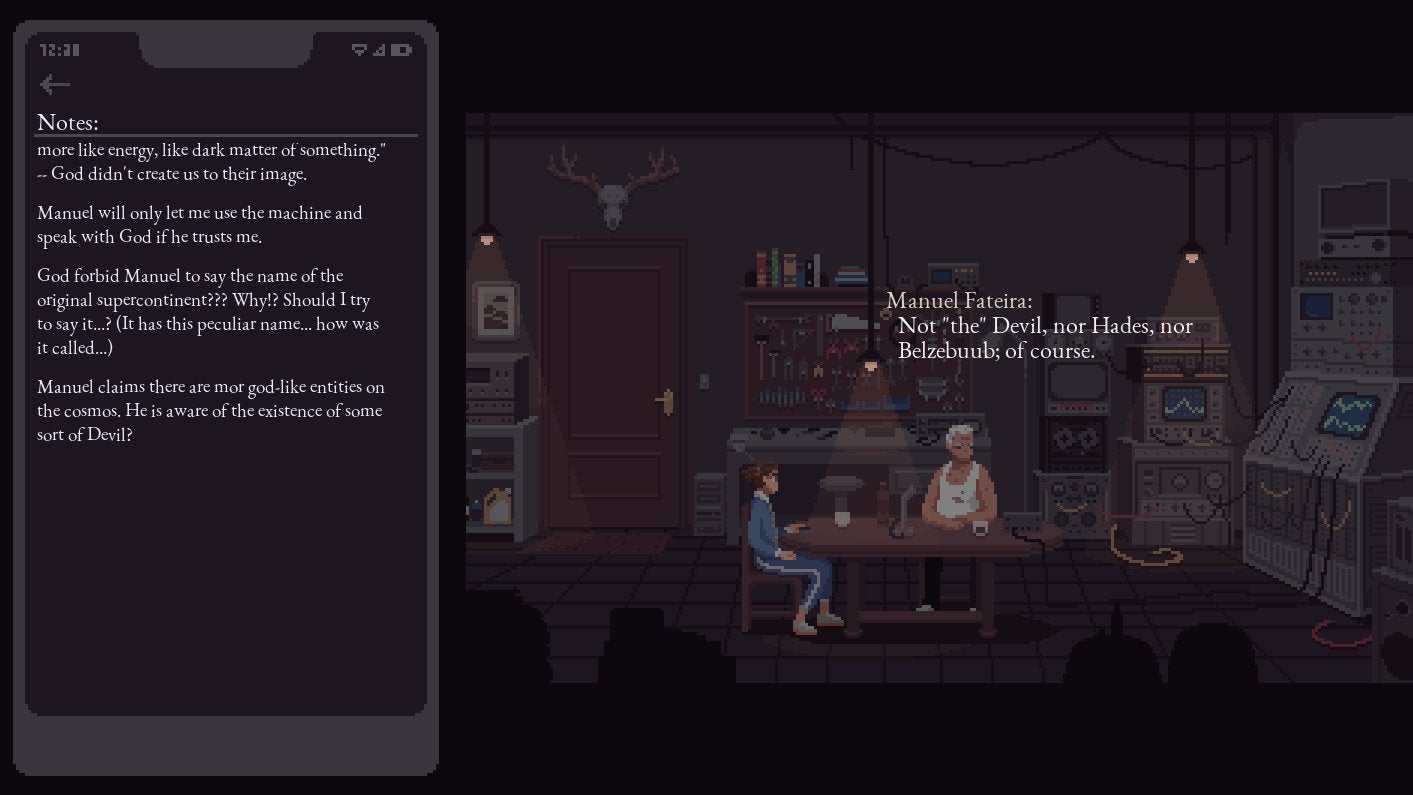Framed as an interview with this distracted messenger, The Whisperer uses a kind of Chatbot interface to let you ask the old man anything you want about his machine, his life, and the divine on the other end of the phone. At the side are your notes, occasionally prompting you to dig deeper into various topics.