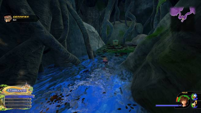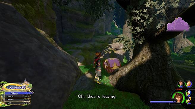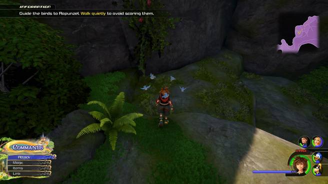 Heading North, you’ll need to fight a lot of Heartless. Use Rapunzel’s special attack as much as you can, as it is very effective here. While heading onwards, watch out for the tree branches you can warp to. The one in the image below leads to a chest.