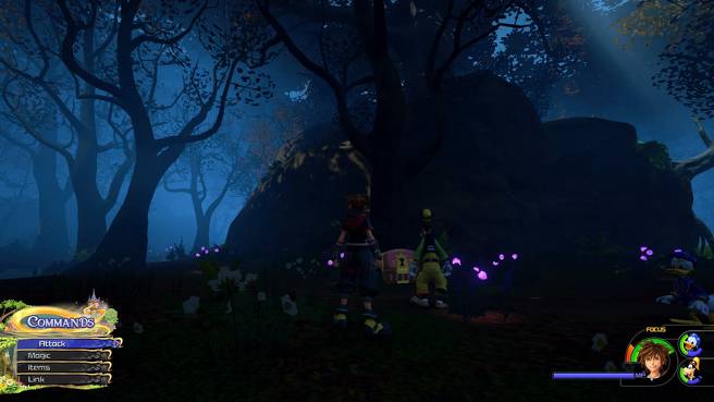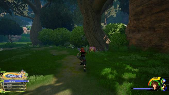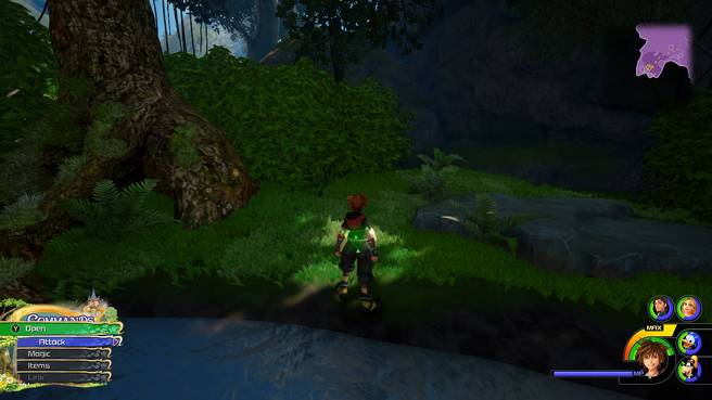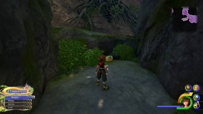 There are more Heartless to take on, and then into the dark part of the forest. In this area there is a Save Point to your left, and a pink chest containing a Map in the center.