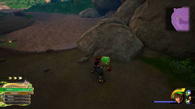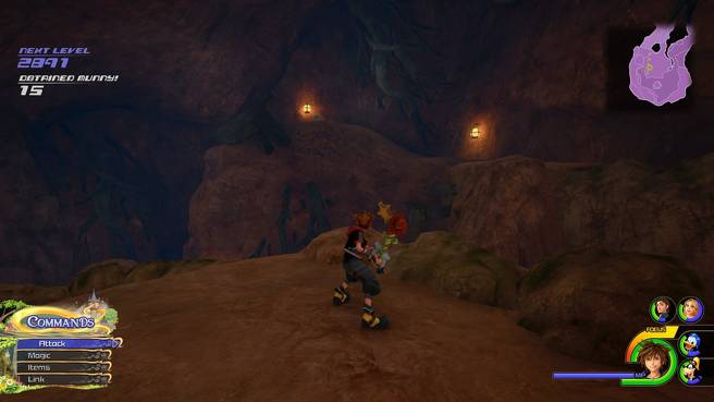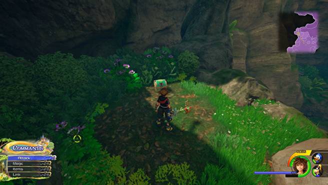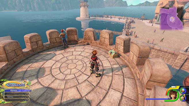 The first thing you’ll encounter in the Kingdom of Corona is a bunch of Heartless. Defeat them (fire is effective here), and then collect the pink chest that is behind them.