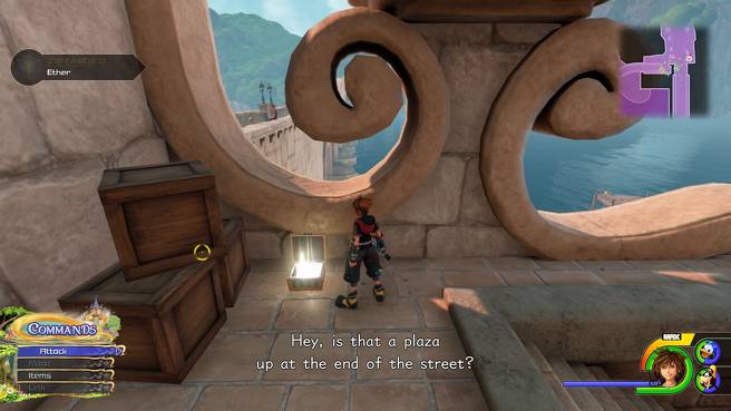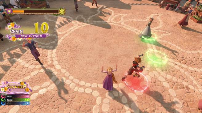 Continue further into the Plaza. There is a dance minigame to complete now. You need to press the buttons corresponding to the colors and commands on screen. While dancing, steer Sora towards any glowing circles to continue a streak. Heading to the edges will allow you to perform on objects around you. Head in to the center to dance with Rapunzel and finish the section.