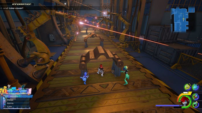 Keep moving and defeating Heartless as they come, until you get to another laser room. You just need to use the same technique as before to dodge the lasers, and then at the end of the conveyor, there’s a Chest to the left. Clear the next conveyor belt and smash the machine, disabling the lasers. There are Ingredients in this room.