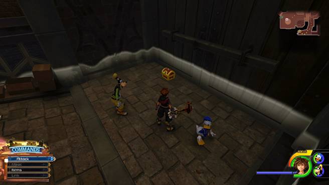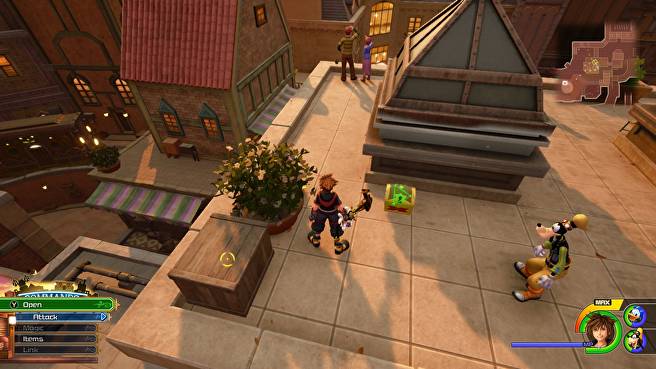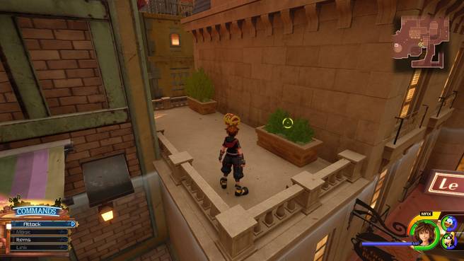 This area is called The Neighbourhood and is made up of a collection of buildings. You can run up the majority of them, so be sure to explore the area a bit before progressing. The Shop in this area is the first where you can use the Keyblade Forge. This allows you to upgrade the Keyblade of your choice, using materials found and synthesized. The chest in the starting area is where you can get the map from.