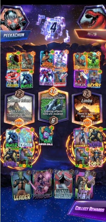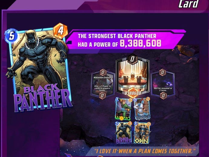 I like how this demonstrates one of the elements that makes Marvel Snap interesting, which is switching your deck up based on featured or hot locations, which are temporarily more likely to appear - though this Panther had it in the bag regardless. That location there is The Throne Room, which doubles the power of the highest ranked card present. Black Panther is a card that starts with 4 power, but his “reveal” ability doubles that when he’s played. Mystique mirrors the ability of a card with an “ongoing ability”, which in this case is doubling Wong’s ability to double reveal abilities. Combine that with Odin, who makes every card repeat their reveal ability, and you have… well, 8,388,608, apparently.