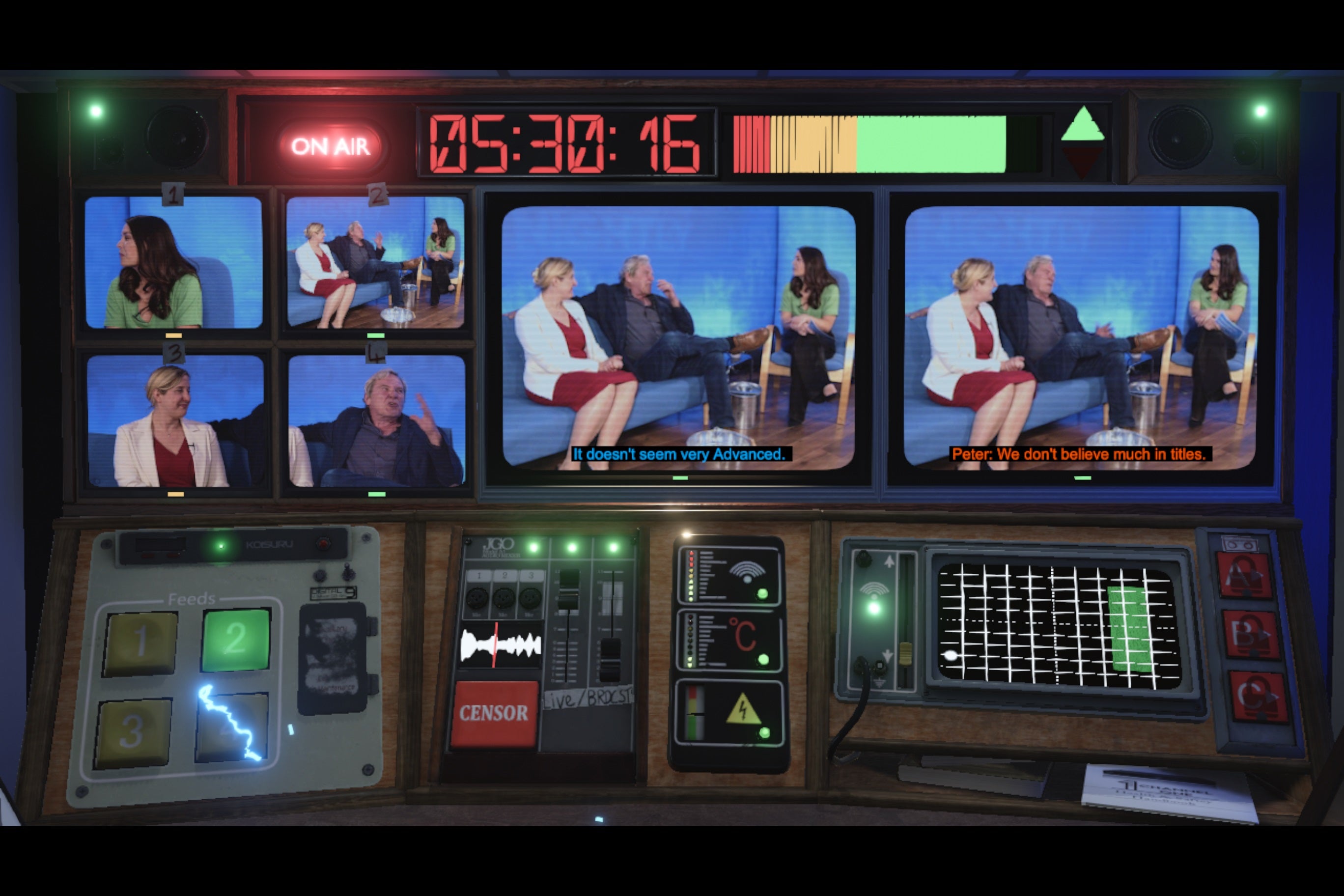 Not For Broadcastplonks you in the seat of a television producer in an alternate reality Britain, circa the late 1980s, in which a radical and authoritarian political party has swept to power on a wave of populism. You’re a cleaner who’s somehow stumbled into the role of almighty broadcast controller, placed in charge of a desk of sliders, dials and censor buttons, and able to switch between one of four live camera feeds on the fly. You are the unseen hand puppeteering the eyeballs of the nation during tumultuous times, with the immediate goal of ensuring that viewing figures go up rather than down, and the longer term objective of steering the government’s propaganda one way or the other.