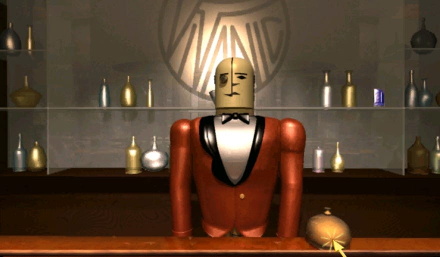 There’s then another sign of such lovely imagination! You’re told to speak to the robot on the desk, but all that’s there is a bell to ring for attention. Ding it, and it lifts up revealing itself as the head of a slumbering automaton. Marvellous stuff. She asks you lots of questions that you answer for her mocking amusement, and then you’re given your room number. So, er, go to your room? Except no, that’s not possible. And you’re already stuck. Because nothing - NOTHING - vaguely hints at what you should do next.