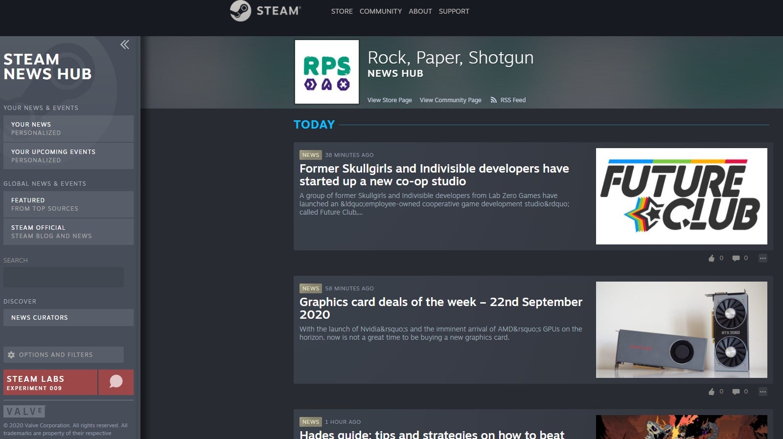 Steam Labs' News Hub experiment has beenin the works since March, but now it’s nearly finished. In a big update before its full launch, you’re now able to see news and articles from your favourite delightful and quirky PC gaming websites. Previously, the News Hub was limited to developer updates from games you play and follow, but now there’s a selection of other sources including “top sites” (like RPS, of course), with more to come in the future.Steam Labs is where Valve conduct all their mad science to come up with features that might improve the platform. Recentlyit introduced optional chat filtersfor profanity and slurs, and it’s also birtheda system that tells you what games you should play next.And now we have a system that tells you what news to read next. You can have a browse of the Steam News Hub for yourselfright here.On your feed, it will automatically show you updates and posts from developers of games you play (you automatically follow these sources if a game is in your library), with a new option to have articles from news outlets appear, too. I’ve given it a little go, and yeah, it’s pretty good. It’s nice to see bits and pieces from game devs themselves mixed in with posts from external websites right there on Steam.News sources use the Steam Curator system, so any curators you currently follow will already show up in your new News Hub without needing to follow them again. If you are looking to follow someone new, just head over to theircurator pageand smash that big green “follow” button.The big idea behind all this is to let you completely personalise your feed to your own tastes, so you’re able to unfollow and mute sources if you just don’t want to see them at all. There are also a load of filters allowing you to hide or show certain content, including an option to hide all the external news entirely, if you so wish.While they don’t give an actual date for Steam New Hub’s full launch,Valve do sayit’s “nearing completion”. So, it shouldn’t be long now before it graduates from Steam Labs Experiment, to fully fledged feature.