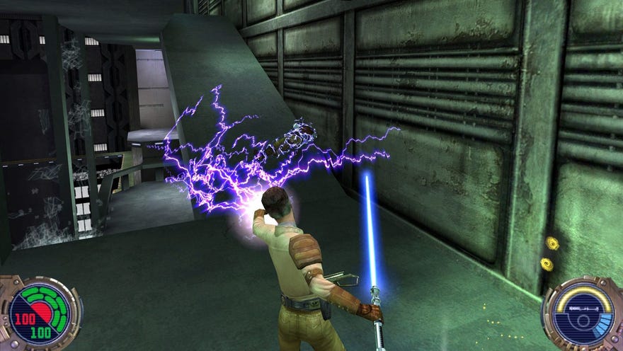 Long before the newest Star Wars movie reduced the bright bolts of Sithlectric to a Palpatinian hand-me-down, like some sort of rare genetic disorder,force lightningwas a power open to any and all space Buddhists who put their twisted minds to it. That includes Jedi monkboys like noted dismemberment enthusiast Kyle Katan, hero of lightsaber ‘em up Jedi Knight II. For him, force lightning had to be attained the old-fashioned way. What happens, you see, is you stretch out your hand, and then you reach deep inside your soul, deeper than any meditative trance has ever taken you, to the profound recesses of all primordial sensation, until, listen, can you hear it, the inner-distant chimes of hidden meaning and spiritual grace, the lost essence of life, flowing like a rivulet of ancient, ornate music. Wait, is that…?