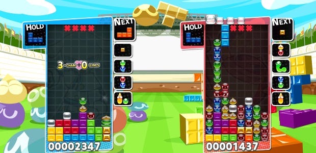 Tetris will probably be the main draw of this crossover, but it’s those mean beans ofPuyo Puyoare where it’s really at. It’s all about matching four of the same colour Puyos to make them pop, but the beauty is in taking the risk of stacking them up, trying for the perfect drop that sets off an explosive chain to bury your opponent’s screen .