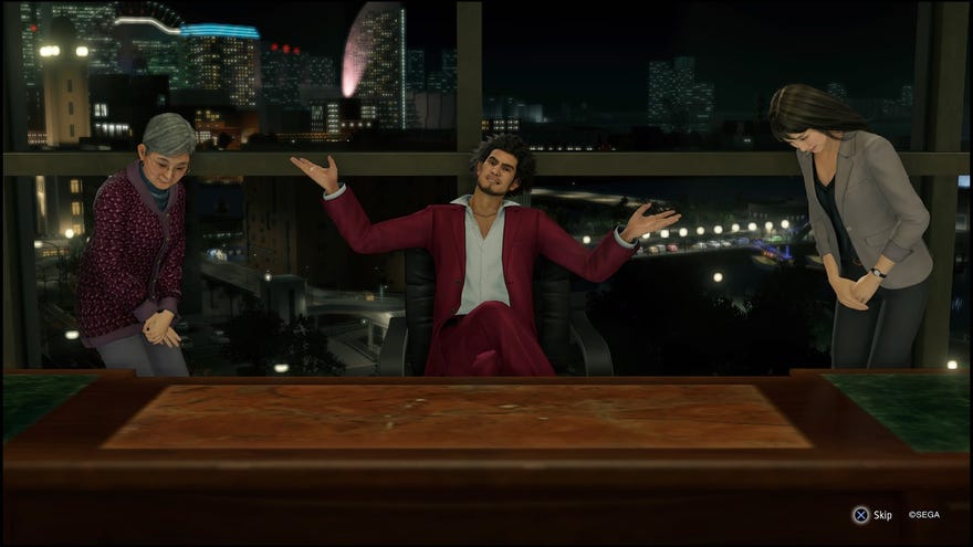 Hong Kong has a popular snack chain called Aji Ichiban. Despite the name, it’s not actually Japanese, but I do recall going to these stores a lot whenever my family and I visited, where we’d fill our suitcases with its giant pack range of Chinese pork jerky and dried mangos.Yakuza: Like a Dragon’s Ichiban Confections is also a snack shop, albeit one that specialises in Japanese rice crackers. It’s also unfortunately on its last legs - unless someone with the right business acumen can turn it around.To see this content please enable targeting cookies.Manage cookie settingsSure, it’s his namesake, but most sensible people wouldn’t entrust their business to Ichiban Kasuga, a man who’s dumb as bricks, can’t even scrape together money for the yakuza, and living on the streets. Yet he’s got an infectious can-do quality to him, and an uncanny ability to turn everything he touches to gold.So begins arguably one of theYakuzaseries’ deepest mini-game timesinks, and the best way to rake in yen. Like everything else in the game, it gets increasingly ludicrous. The senbei shop is just a stepping stone to amassing a whole business empire, as your investments go from dodgy run-down establishments to getting staff to manage corporate buildings and glitzy night clubs.Who better to run a high-end cabaret club than a ten-year-old kid with an escaped circus monkey?Your staff are a proper wild bunch, especially once you start recruiting the oddballs you meet during side quests, who of course turn out to be model employees. Who better to run a high-end cabaret club than a ten-year-old kid with an escaped circus monkey and a giant vacuum cleaner? If you’ve got the funds, you can train them into a managing director in no time!But your employees are also there to back you up during tense shareholder meetings that play out like mini RPG battles as you try to withstand a row of angry shareholders. The better you treat your employees, the more effective they are at pushing back against accusations of underperforming sales or bad investments. It’s a battle of persuasion rather than fisticuffs, but no less satisfying when you manage to placate the angry rabble into sitting the fuck back down.Occasionally, I catch myself wondering if this climb to the top of Yokohama’s business world is too conveniently sugar-coated. Am I not succumbing to the same old capitalist trappings, watching numbers rocket each quarter while businesses become disposable assets, sold as soon as the next profitable venture is in sight in the endless pursuit of exponential growth? And surely the answer to assuaging overworked and unsatisfied employees isn’t just throwing more money at them?Yet, given how Ichiban’s heart is so raw and earnest, when you splash out on cheesy ads to boost your sales, which later become a pastiche of all that slick benevolent corporate branding that transcends product, you really do believe it’s delivered without a shred of cynicism. Plus you have to marvel that his ultimate move to turn around a room of shareholders is to launch himself down on his knees with a grovelling apology.You’d love to see Bezos do the same.