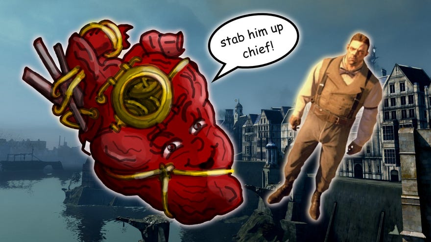 But I suppose the really delicious bit for me, in this particular games burger, is the big pile of juicy lore stacked between its electric buns. Dishonored is a rare example of a game world that interests me so much, I actively read every book, note, poster and fish tin I can get my gristly hands on, just to marinate in it all. Rightly confident in its strength, the game has offered me a few ways to indulge this fascination further. But the best of them has to be the Horrible Haunted Heart.