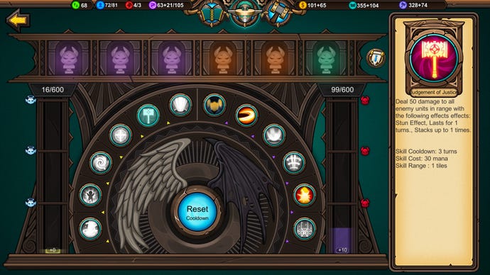 Where they capitalise on overwhelming and building momentum, the animal faction are more tactical, with troops that perform better when given a turn to cycle on the front line, and spells based around placing temporary totems on the map. The wood-and-brass robots are very expensive but hardy and able to self-repair, and more about positioning and map control, with spells that launch bombs and fire around to trammel enemies into position, and unit attacks that knock them around and into each other for extra damage. I mentioned spells a few times there, because that’s another layer still: each faction constantly generates mana too, to power its own unique set of spells, which can be upgraded with research points… or you can direct that research into military or economic upgrades instead.