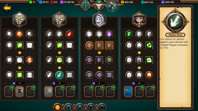 Even without those items, you’ll be upgrading your units en masse on a per-type basis using industry points. Instead of picking bonuses for individual units as they level up (they do gain XP, but levels simply increase their numbers automatically, making experienced units desirable without requiring micromanagement), those industry points unlock your choice of specialisations for a whole troop type. Most of these choices are exclusive, so once you’ve committed to making your archers better damage dealers, you’ve sealed off the chance to make them more durable, but later choices might let you mitigate that, or double down on their specialty, or add a secondary effect to their special attack. And that’s if you touch archers at all. You might instead invest your industrial hammers in upgrading your expensive support class or magician, or give a few upgrades to all your unit types for a more broad military strategy.